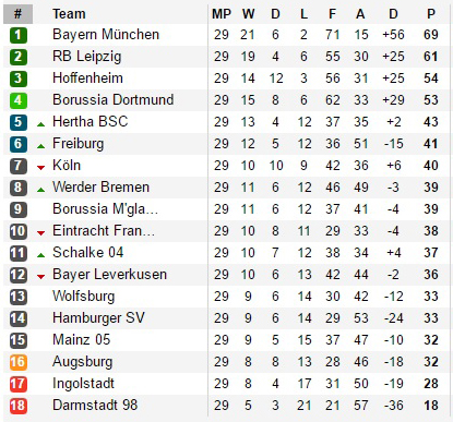 Ключевые фигуры чемпионата Германии все те же. «Бавария» на одной ноге не смогла переиграть «Байер», который должен быть благодарен Фортуне, «Лейпциг» гарантирует себе впервые в истории место в розыгрыше Лиги чемпионов, сделав это с первой попытки, «Боруссия» Дортмунд наконец-то побеждает и продолжает преследование тройки лидеров, а «Дармштадт» оттягивает свой вылет во второй дивизион, вырвав победу на 92-й минуте у «Шальке». «Хоффенхайм» же добывает веселую победу над Гладбахом и не подпускает к себе Дортмунд.