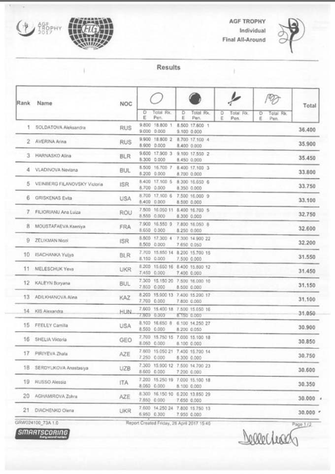 Алена Дьяченко, к сожалению, допустила серьезную потерю предмета в упражнении с обручем (14,250), однако успешно справилась с программой с мячом (15,750). С суммой 30,000 Алена занимает промежуточное 10-ое место.