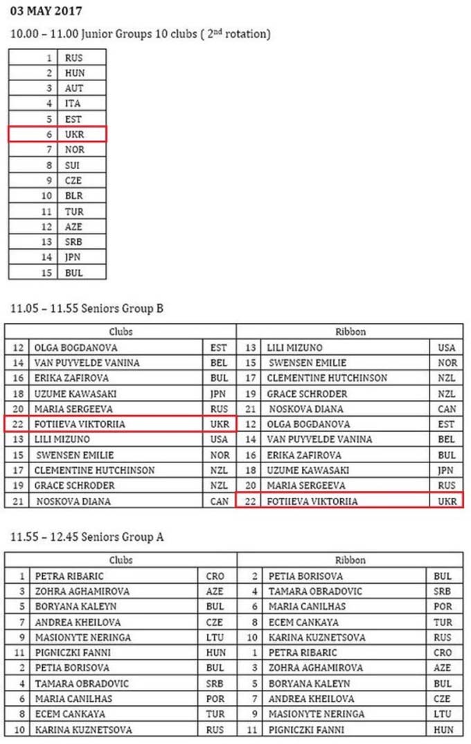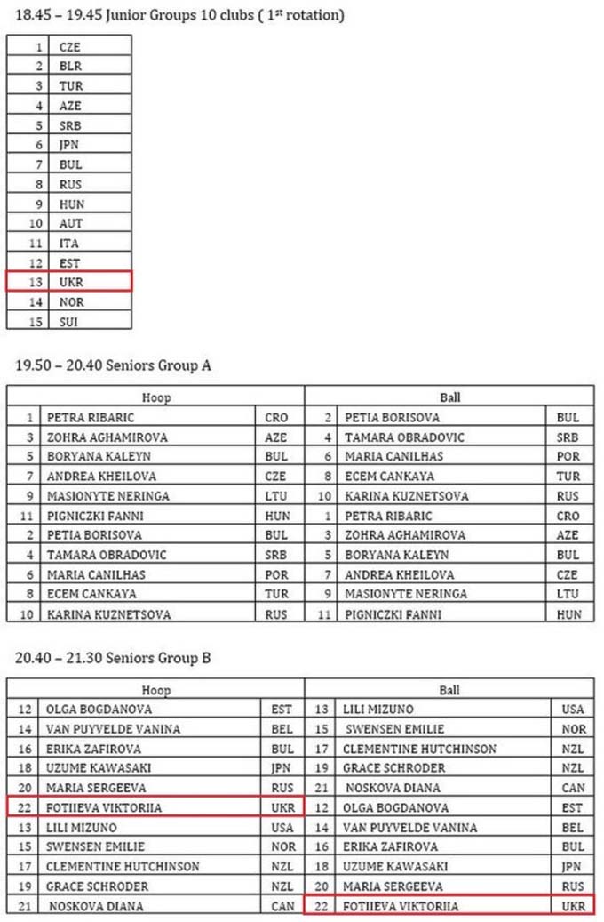 Украина будет представлена на этом старте юниорской сборной командной в групповых упражнениях, а также победительницей Международных турниров и Спартакиады Викторией Фотиевой.