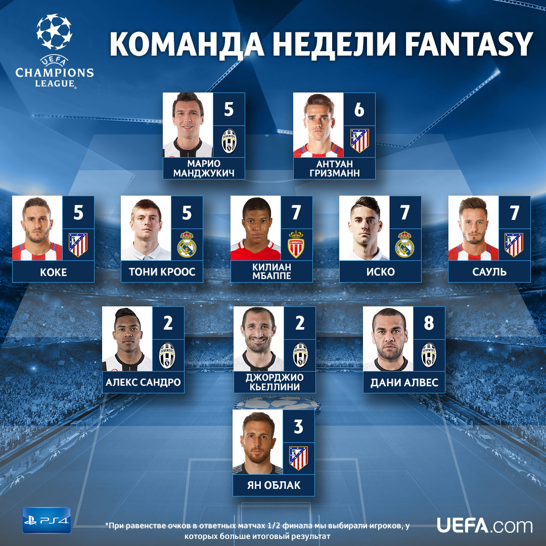 По итогам ответных матчей в Команду недели Лиги чемпионов попали представители всех четырех полуфиналистов. Смотри, кто проявил себя наиболее ярко.