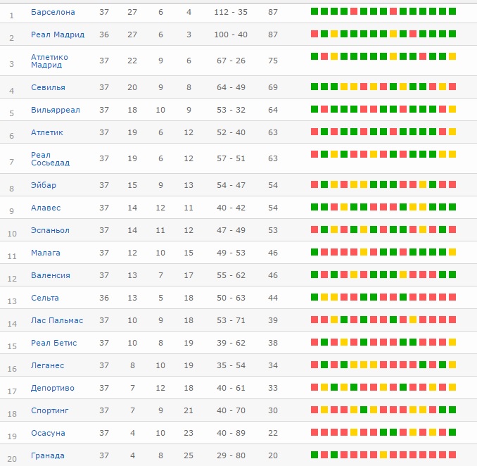 «Атлетико» может спать спокойно – третье место у них в кармане. Подопечные Сампаоли закончат сезон на четвертом месте. «Реал» и «Барселона» продолжат борьбу за чемпионство – это, пожалуй, единственная интрига в Ла Лиге за тур до конца сезона.
