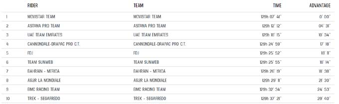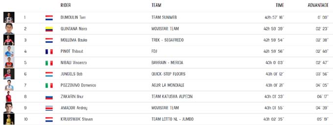 Индивидуальную гонку на время протяженностью почти 40 километров Дюмулен проехал практически идеально, он перевыполнил свой план, сумел привести конкурентам по генералу несколько минут. Вторым стал Джерайнт Томас из Sky, который проиграл победителю 10 этапа 49 секунд. Юнгельс оказался в 56 секундах от результата голландца. В тоже время Нибали уступил Дюмулену две минуты семь секунд, Моллема – 2:17, Закарин, у которого хороший индивидуальный ход, 2:19, Пино – 2:42, Стевен Круйсвик – 2:43, а Кинтана и вовсе – 2:53.