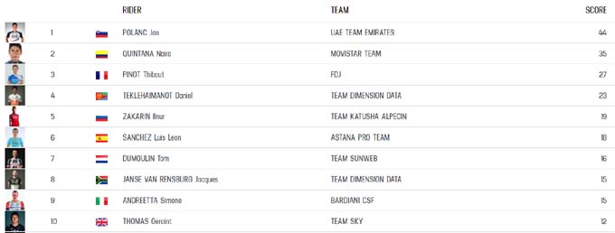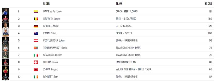 Если взять разборки спринтеров, то пока лучше остальных выглядит Фернандо Гавирия, который записал в свой актив победу на двух этапах и лидирует в очковой номинации. По разу свои спринтерские способности продемонстрировали Андре Грайпель и Калеб Эван. Остальные этапы заканчивались победой отрыва.