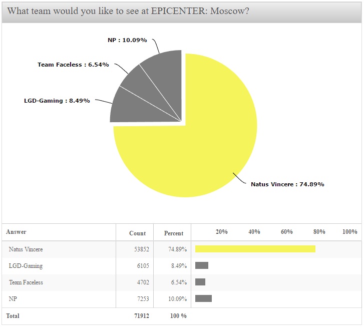 Несколько дней назад мы запустили открытое голосование с целью определить последнего участника EPICENTER: Moscow. По результатам голосования лучшей оказалась команда Na'Vi! За игроков украинского клуба проголосовало 53,8 тыс. человек, что составило почти 75% от общего числа респондентов.