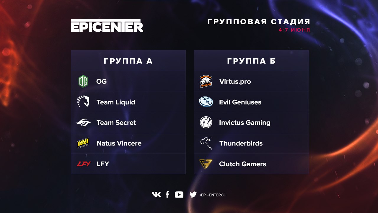 Групповой этап EPICENTER: Moscow 2017 пройдёт по круговой системе. Команды сыграют матчи до двух побед. Первые команды посеют в полуфинал. Коллективы, которые займут второе и третье место, пройдут в четвертьфинал. Групповой этап пройдёт с 4 по 7 июня.