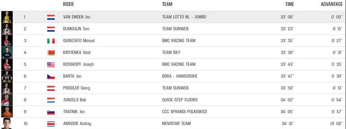 Однако эти 38 секунд ничего для Дюмулена перед его любимой, весьма длинной разделкой на последнем этапе. Но до этого оставался еще один день с финишем в Ассьяго – последняя возможность у всех, чтобы получить еще немного преимущества над голландцем. Так оно и случилось. У Тома был весьма плохой день. На этом должен был изыскать Кинтана. Однако, несмотря на то, что Том весьма быстро отпал от лидеров, то, что гора была за 15 километров до финиша помогло гонщику Team Sunweb. Он в итоге проиграл только 15 секунд Кинтане, Пино, Закарину и Нибали. Для последних это было разочарование, а для Дюмулена успех.
