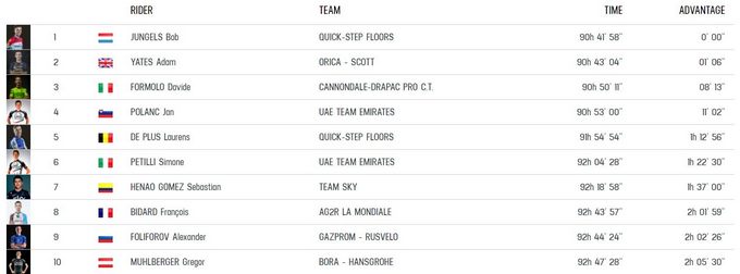 Вторым в итоге стал Кинтана, который проиграл в общем зачете победителю 31 секунду. Винченцо Нибали стал третьим, Тибо Пино – четвертым. Пятерку замкнул Ильнур Закарин.