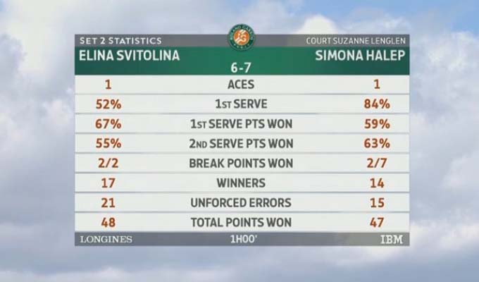 Второй сет Свитолина начала с брейка на подаче соперницы, а через пару геймов сделала еще один, выиграв «под ноль» подачу румынки. Далее соперницы обменялись геймами и украинка при счете 5:2 подавала на матч. К сожалению, Халеп совладала с эмоциями, сравняла счет в партии и даже первая заработала шестое очко. В 12 гейме Свитолина отыграла 4 сетбола и перевела партию на тай-брейк, на котором, к сожалению, уступила.