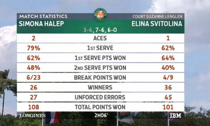 И во втором Элина сразу включилась, и снова счет в ее пользу начал расти, как на дрожжах. И опять при счете 5:1 наступил некоторый спад, который Халеп использовала на все 100%. Она просто включила режим бога, вытаскивая и достаточно неудобно отыгрывая практически все, что летело на ее половину корта, а летело много чего и сильно. К концу сета начало казаться, что Свитолина играет против теннисного робота, который все тащит и совершенно не ошибается. Ценой невероятных усилий при счете 5:6, 0:40 на своей подаче Элина перевела сет на тай-брейк, где отдала, кажется, последние эмоции. На матчболе при счете 5:6 Халеп неожиданно идет в атаку и попадает в самую линию, сравнивая счет. Ну а при счете 6:7 случается совершенно обидная вещь. Вытаскивая в очередной растяжке мощный кросс Свитолиной, румынка попадает в трос и мяч мягко падает на стороне Элины, принося Халеп победу в сете. Понятно было, что в третьем сете борьбы уже не будет, так и произошло.