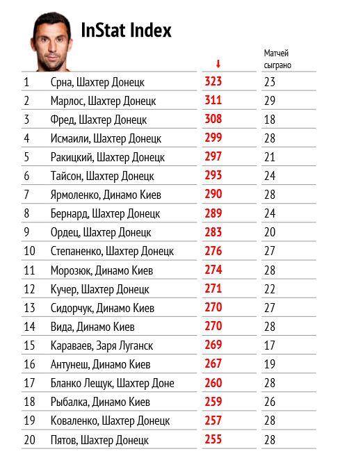 Исходя из подсчета аналитиков портала InStat Football, капитан «горняков» стал самым полезным игроком чемпионата. На счету хорвата 323 балла. На 12 и 15 пунктов от него отстали его партнеры по команде Марлос и Фред соответственно.