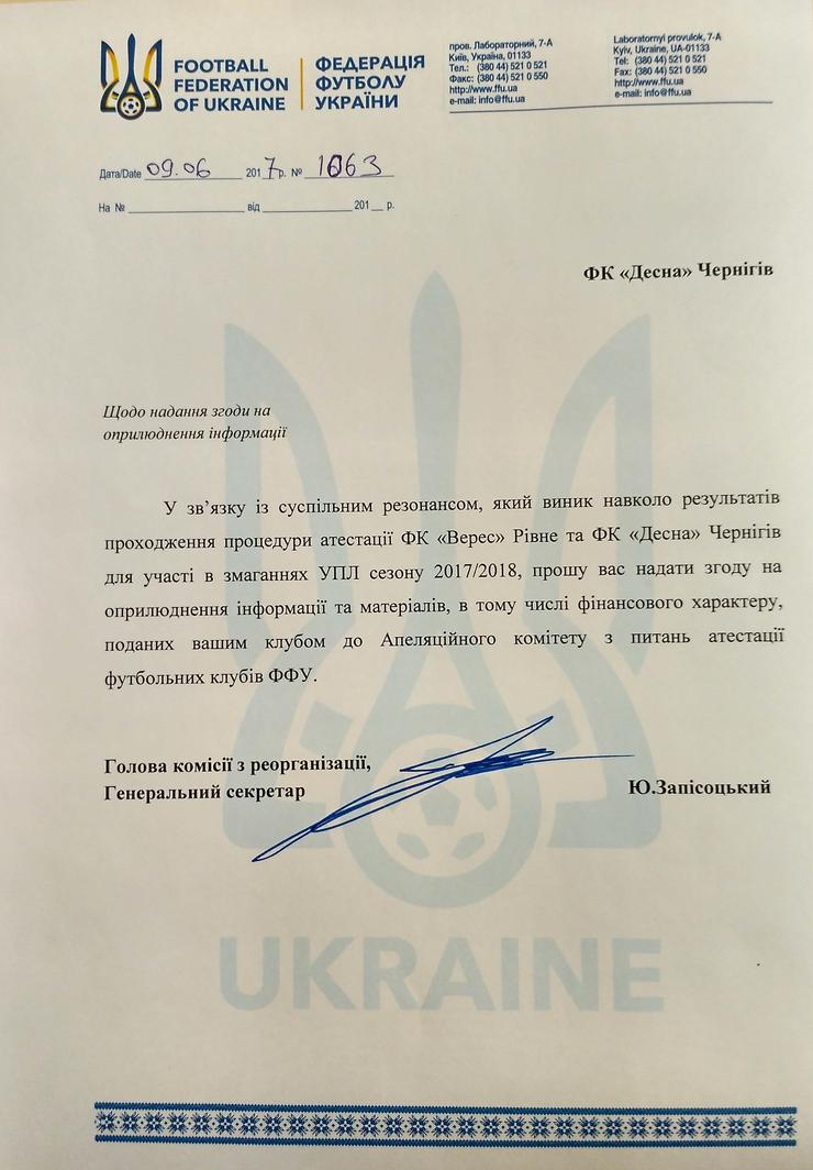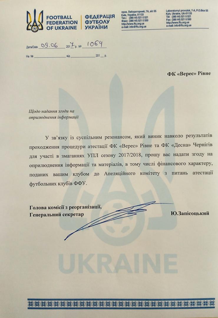 Підсумки атестації нових учасників Прем’єр-ліги сезону 2017/2018 викликали значний резонанс в суспільстві. Федерація футболу України готова оприлюднити документи, що були надані для атестації клубами «Десна» та «Верес», та безпосередньо вплинули на рішення щодо видачі атестатів. Для цього ФФУ звертається до клубів із проханням надати письмову згоду на публікацію цих даних на офіційному сайті Федерації. Про це розповів Генеральний секретар ФФУ та заступник голови Комітету УЄФА з ліцензування клубів Юрій Запісоцький.