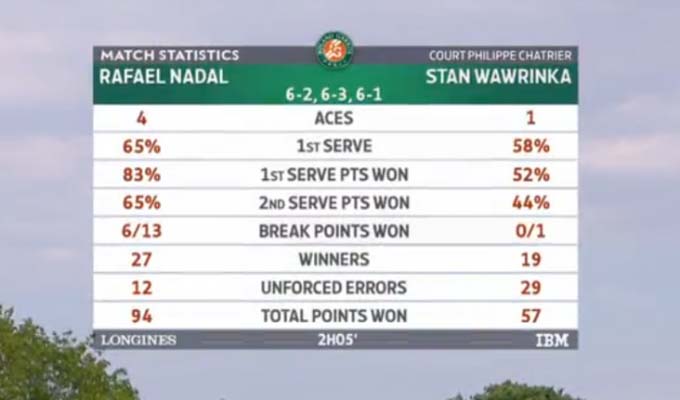 В финальном поединке 31-летний испанец не оставил шансов швейцарцу Стэну Вавринке. Матч продолжался чуть более 2 часов и закончился убедительной победой Надаля в 3 сетах.