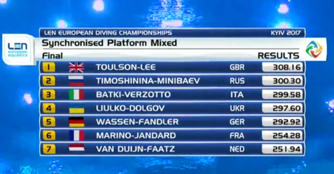Украинская пара Валерия Люлько - Максим Долгов заняла четвертое место на чемпионате Европы по прыжкам в воду. В синхронных прыжках с 10-метровой платформы украинца не хватило 2 баллов до медали.
