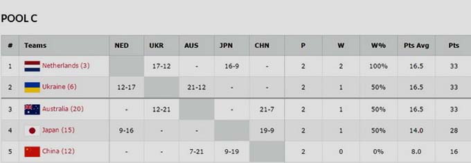 Після першого ігрового дня збірна України йде на другому місці у гріпі «С». Разом з нашими дівчатами одну перемогу у двох матчах здобули збірні Японії та Австралії. Очолює групу збірна Нідерландів. У плей-оф чемпіонату Світу виходить дві команди.