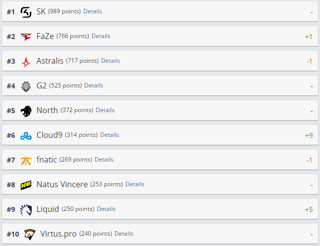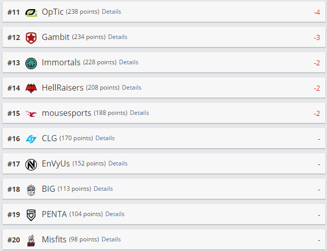 Gambit Esports после вылета из первой десятки расположилась на 12 месте. Команды Immortals, HellRaisers и mousesports опустились на две позиции каждая и занимают с 13 по 15 места. Топ-10 также покинула OpTic Gaming — 11 строчка.