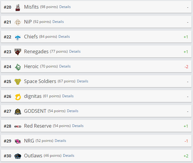 В топ-30 появился полуфиналист закрытой квалификации к DreamHack Valencia 2017 — Outlaws. Представители Австралии Chiefs eSports Club и Renegades улучшили позиции на одну строчку и расположились на 22 и 23 местах. Ninjas in Pyjamas сохранили 21 место.