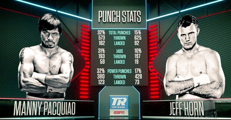 38-летний Пакьяо выглядел в ринге гораздо хуже, чем в свои лучшие годы - филиппинец явно постарел, заметно упала скорость, ухудшилась реакция, рефлексы - но все равно он был лучше своего молодого оппонента. Бой длился все 12 раундов, большинство из которых выиграл Пакьяо (например, на карте Дэна Рафаэля он победил со счетом 117:111, как и на карте Тедди Атласа), однако домашние стены и желание старого хитрого лиса Боба Арума сделать себе звезду на Австралийском континенте на имени легенды, которая и так вот-вот собиралась завершать карьеру, сделали свое дело, и судьи отдали победу Джеффу Хорну со счетом 115:113, 115:113 и 117:111.