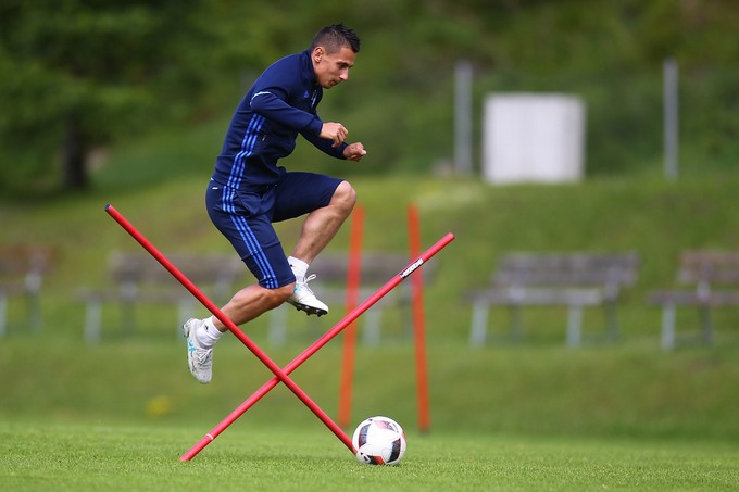 Сначала полевые игроки были разделены на три группы, каждая из которых выстроилась напротив трех ворот. Каждый по очереди должен был выполнить силовое упражнение, получить нагрузку, затем пробежать через серию тренировочных фишек и только потом пробить по воротам.