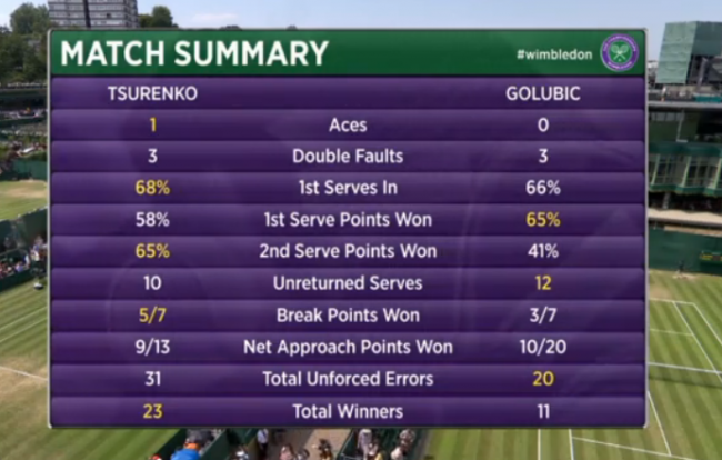 Третий сет начался ровнее. Только в пятом гейме Цуренко получила шанс взять подачу соперницы и воспользовалась им. В следующем гейме украинка отыграла 2 брейка и сделала счет в партии 4:2 в свою пользу. Голубич смогла выиграть свою подачу, а следующие два гейма принесли Лесе путевку в третий круг Уимблдона!