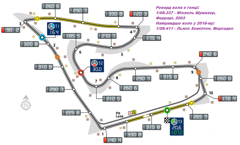 кваліфікація: 1:07.922 (2016, Льюіс Хемілтон) гонка: 1:08.337 (2003, Міхаель Шумахер) |