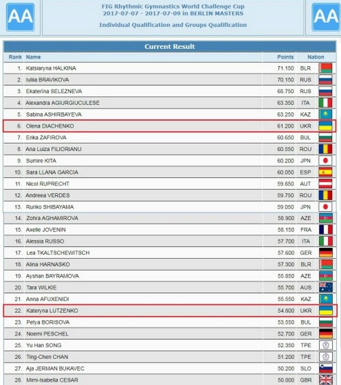 9-го июля на этапе Челлендж-Кап в Берлине завершилось многоборье, являющееся квалификацией в финалы в отдельных видах. Гимнастки демонстрировали свои программы с булавами, лентой и 3 мячами/2 скакалками.