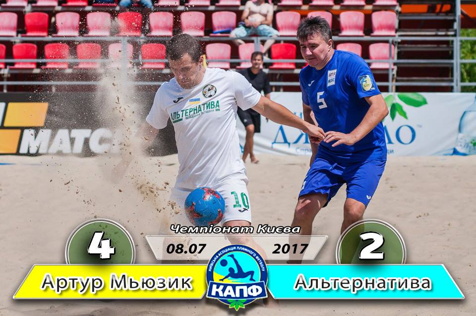 А на вторую позицию в турнирной таблице поднялась команда «Артур Мьюзик», которая в отсутствии Виталия Сидоренко и Ивана Глуцкого обыграла «Альтернативу» 4:2. За пять секунд до завершения первого тайма играющий президент «АМ» Иван Слободянюк срезал мяч в свои ворота, но это музыкантов не смутило. В дальнейшем они наращивали преимущество, и их победа была закономерной и уверенной. Отметим, что у «Альты» отсутствовал главный тренер Николай Костенко, который в составе сборной находился в Португалии. После игры всегда позитивный президент ФК «Альтернатива» Валерий Чернев отметил, что результат «по делу», а задача у его команды остается прежней - войти в четверку лучших по итогам группового раунда, чтобы, как минимум, сыграть в бронзовом матче.