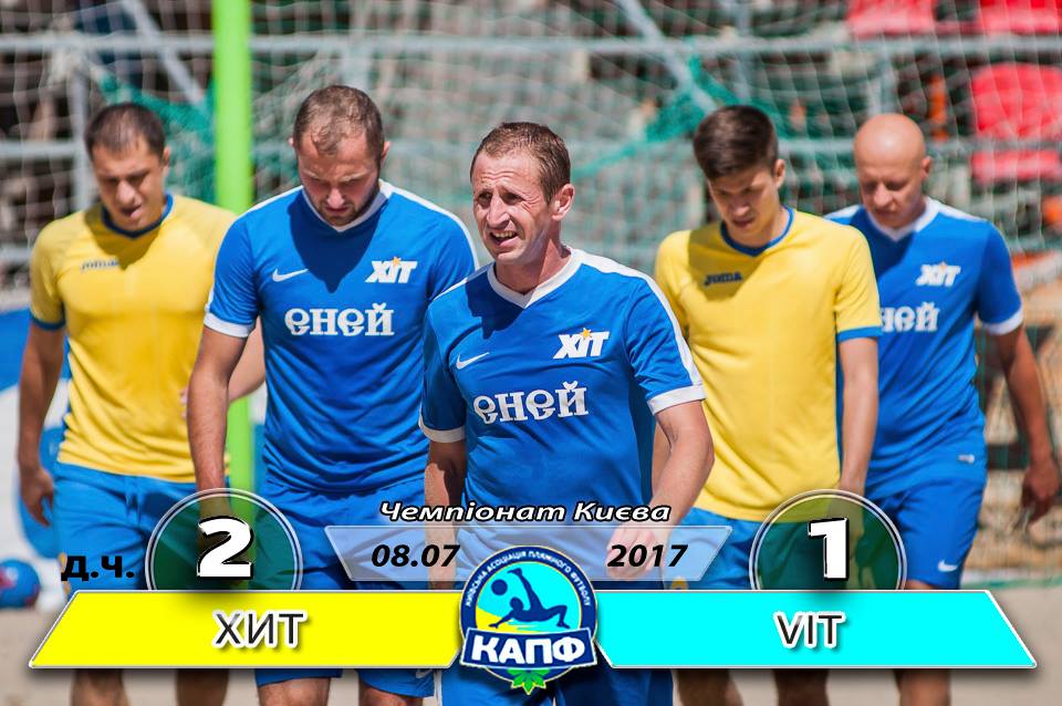 В связи с участием игроков «Гриффина» и «Евроформата» в составе сборной Украины на этапе Евролиги в Португалии, в 7 туре Высшей лиги чемпионата Киева по пляжному футболу были сыграны матчи без участия этих команд. Открывали седьмой игровой уик-энд сильнейших команд столицы чемпионы 2015 года из клуба «ХИТ», которым противостояла команда «VIT». В команде Олега Лукьяненко отсутствовали братья Борсуки, Александр Корнийчук и Тарас Коваленко, поэтому ребята Александра Зубенко конечно-же желали использовать такую ситуацию в свою пользу.