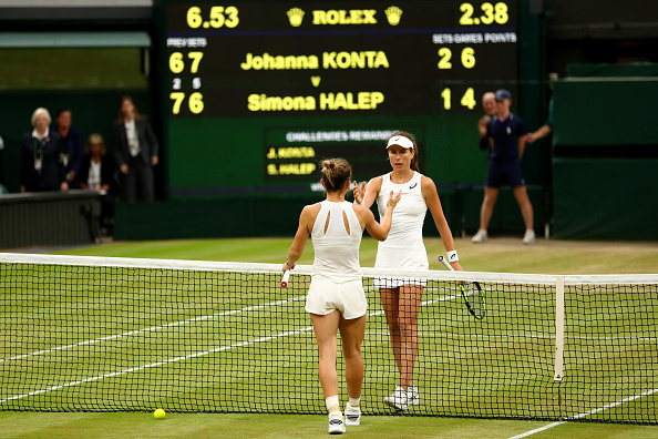 Представительницы Британии в тяжелейшем поединке одержала верх над второй ракеткой мира Симоной Халеп из Румынии. Проиграв первый сет на тай-брейке, Конта ответила тем же во второй партии, а также оказалась сильнее в решающий момент поединка: 6-7(2), 7-6(5), 6-4. Любопытно, что в полуфинале Уимблдона британки не играли целых 39 лет.