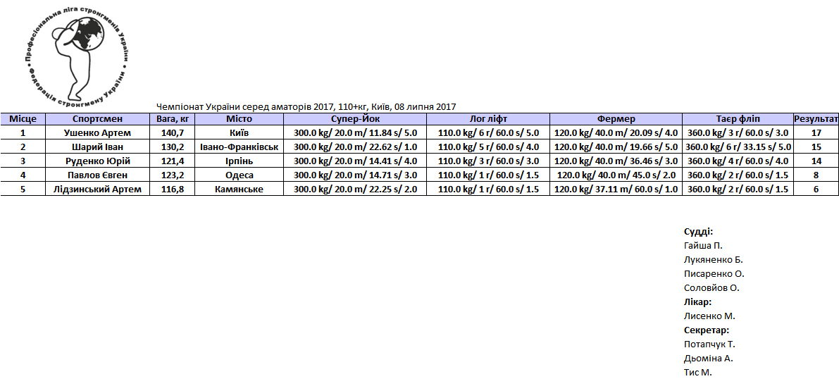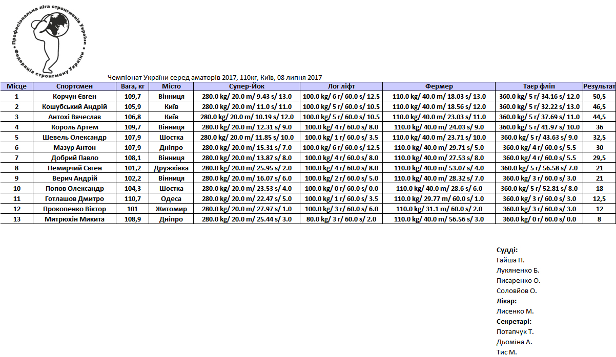 У вазі до 110 кілограмів лідер визначився зі старту змагань – вінничанин Євген Корчун три вправи поспіль завершував на чолі заліку, лише в одній із них розділивши першість з Антоном Мазуром із Дніпра. Перед заключною дисципліною перевага Корчуна над конкурентами вимірювалася у 5 балів. Відтак Євген впевнено виконав кантування 360-кілограмового колеса і перетворив своє лідерство на чемпіонство. А от за титул віце-чемпіона точилася надзвичайно запекла боротьба: кияни Андрій Кошубський та В’ячеслав Антохі йшли по турніру «ніздря в ніздрю», набравши перед фінальною вправою однакову кількість очок. В очному протистоянні Кошубський був швидшим і сильнішим, тому саме йому дісталася перемога у вправі й «срібло» національного чемпіонату. В Антохі – «бронза».