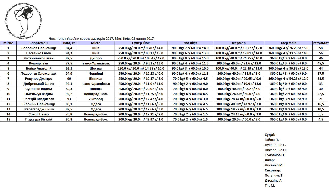 Серед найлегших стронгменів боротьба тривала до заключної вправи. Кияни Євген Настенко та Олександр Соловйов по черзі тріумфували в окремих вправах. Перед фінальним випробуванням – «Кантуванням покришки» (360 кг) Соловйов випереджав основного опонента на один бал. В очному протистоянні лідер зумів довести свою перевагу і заслужено здобув «золото» чемпіонату України. Варто відзначити й володаря «бронзи» Євгена Литвиненко з Дніпра, котрий виграв одну із окремих вправ («Лог ліфт» 90 кг на рази) і продемонстрував стабільність у результатах. На комплімент заслуговують і володарі четвертого та п’ятого місць – Іван Кушнір з Івано-Франківська та Анатолій Бойко з Шостки, які програли бронзовій позиції всього лиш пів і два бали відповідно.