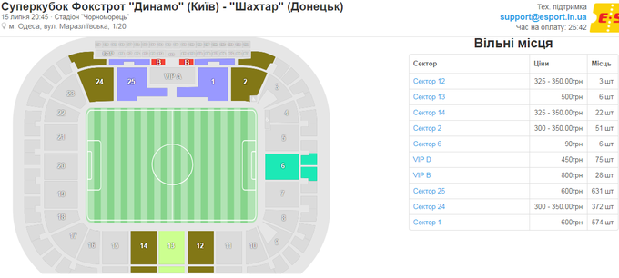 На матч за Суперкубок Украины между донецким «Шахтером» и киевским «Динамо» осталось чуть более 1700 билетов по состоянию на 14:00 14 июля. По данным сайта, на кототором еще можно купить билеты на эту игру, стоимость оставшихся билетов колеблется от 90 до 800 грн.