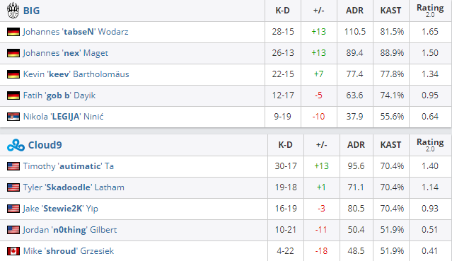 Межконтинентальная встреча состоялась между командой из Германии и оппонентами из США. BIG вновь выбрали карту de_inferno для противостояния с Cloud9. После очередных проблем с сервером, коллективы доиграли вне трансляции. Победителями данного «best of one» стали ребята из BIG, со счетом 16:11.