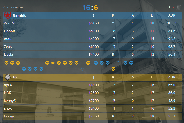 Последняя карта с участием СНГ-коллектива на сегодня. Gambit Gaming играют против французов из G2. Команды, для решения вопросов, выбрали локацию de_cache. Настолько высокого уровня игры как в атаке, так и в обороне от “Zeus’a” и команды противники не ожидали. Вторая победа для Gambit 16:6.