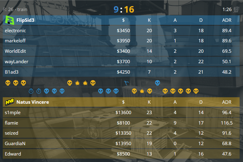И вновь СНГ-противостояние на групповом этапе. В этот раз лицом к лицу сошлись Natus Vincere и Flipside Tactics. Полем боя была пикнута карта de_train, на которой команды показали хорошую игру. После технической паузы «B1ad3» и компания не смогли вернутся в игру, - победа за желто-черными 16:9.