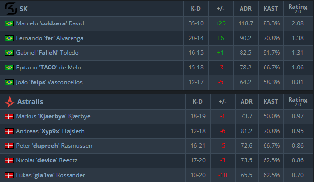 Невероятная пара сошлась в рамках групповой стадии. Astralis сыграли с SK Gaming. Чтобы показать нам уровень подготовки к мажору команды выбрали карту de_inferno. Ошибки от датчан, высочайший уровень игры от бразильцев и победа за последними 16:8. Счет в серии за два дня 2-0.