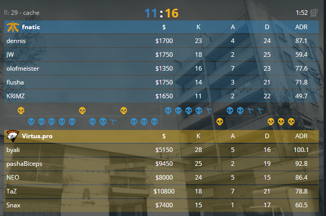 Последняя заруба на сегодня была организована между игроками Virtus Pro и Fnatic. Интересным выбор стала карта, на которой сошлись «золотые» команды, - de_cache. Красивый розыгрыш от обеих команд, но сильнее была команда-«хозяйка» данного турнира. Финальный счет 16:11 и вторая победа в копилку.