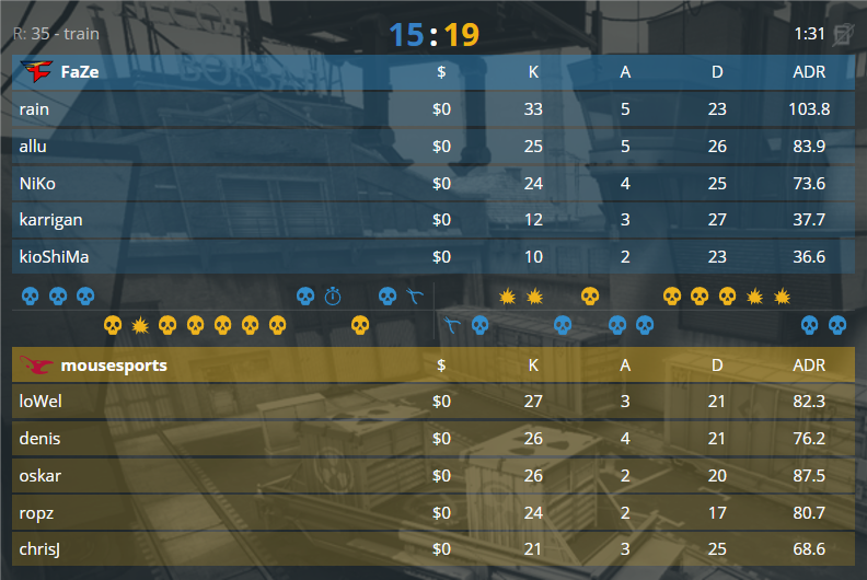 Дальше на карте de_train сошлись два европейских коллектива, Mousesports сразились с Faze Clan. Сильная карта в пуле обеих команд, оправдала все ожидания, и перешла на дополнительные раунды. Закончилась с неожиданным результатом, - победа «мышек» 19:15.