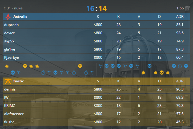 Еще одну путёвку в матчи за выживание разыграли между собой команды Astralis и Fnatic. Розыгрыш был проведён на локации de_nuke. Очень напряженные 30 раундов, качели в обе стороны и нереальные «минус 3» от «devicе» в последнем раунде. Победа за датчанами 16:14.