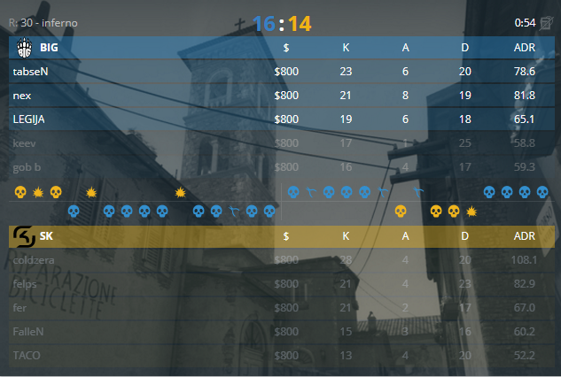 Последняя карта на сегодня de_inferno в исполнении команд BIG, которые сразились с SK за еще одну путёвку в плей-офф. Стабильная игра от германского коллектива, и этого было достаточно, чтобы не попасть под бразильский каток. Это сенсация, победа BIG 16:14.
