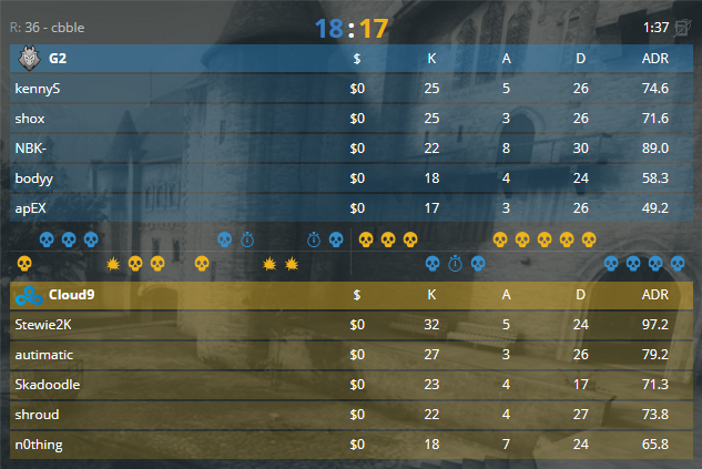 de_cobblestone набирает популярности в течении третьего дня групповой стадии. В этот раз локацию выбрали для противостояния команды G2 и Cloud9. Качественная, равная игра в исполнении коллективов из Франции и США. Игра перешла на дополнительные раунды. Победа за французами 19:17.