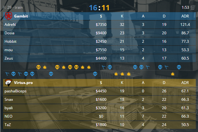СНГ-дуэль за выход в плей-офф Краковского мажора состоялась между Virtus Pro и Gambit Gaming. Решать этот вопрос поехали на карту «поезда». Очень напряженная заруба и победа последних со счетом 16:11. Поздравляем Gambit!