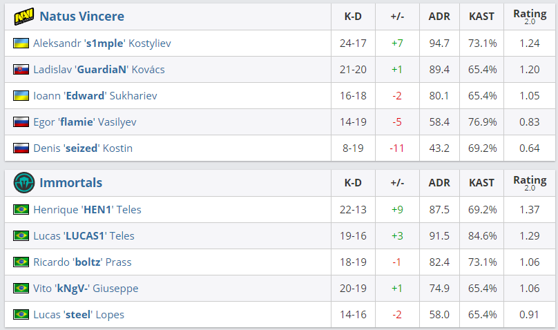 Очень интересная пара сошлась на серии 1-1. Simple и ко мерялись силой с бразильской пятеркой из Immortals. Картой, на пути NaVi к званию «легенды», была выбрана de_overpass. Но встретив очень сильную игру от «бессмертных», ничего не смогли противопоставить. Желто-черные проигрывают 16:11.