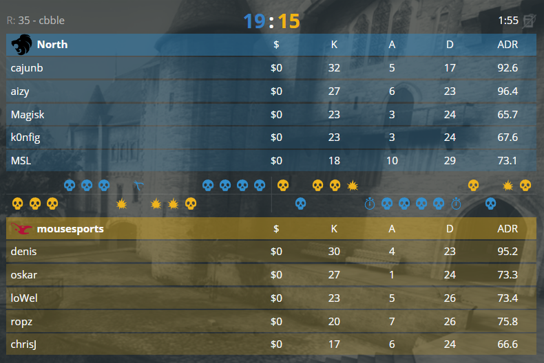 Первым de_cobblestone на PGL Krakow решила порадовать нас команда North, которая сыграла против Mousesports. Очень напряженная и качественная ирга в исполнении команд по обе стороны баррикад. В результате камбек от датчан, дополнительные раунды и победа за North, - 19:15.
