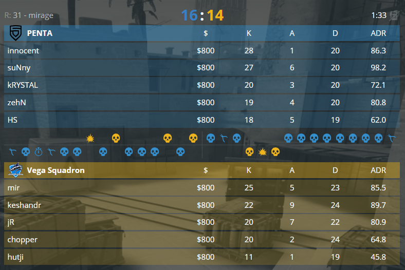 Первый матч на выбывание сыграли ребята из Vega Squadron против команды Penta Sports. Кто же первым покинет этот турнир решали на карте de_mirage. Красивая игра от акул, но серия ошибок не дала им остаться на этом турнире. Победа Penta – 16:14.