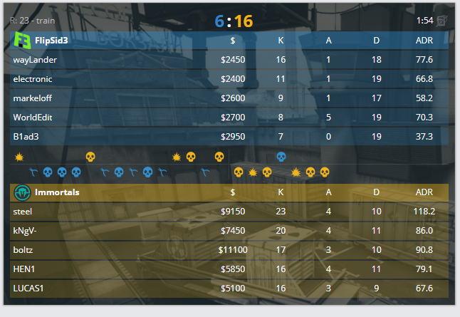 Последний матч дня, последняя путёвка на Tauron Arena, последняя СНГ-команда. Flipside Tactics сразились с Immortals на карте de_train. Но истории золушки не случилось, проигранный форс, еще в первой половине, подкосил нашу команду. Победа за «бессмертными» 16:6.