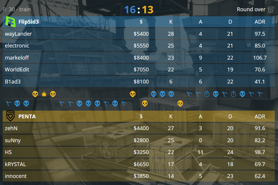 Еще одни «поезда» мы увидели в исполнении Penta Sports, которые сыграли против коллектива Flipside Tactics. Уверенная игра от последних не оставила шансов для противников. Украинская команда побеждает со счетом 16:13. И продолжает бороться за возможность сыграть в плей-офф.