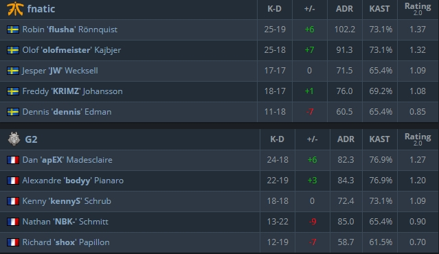 Еще один de_overpass во время противостояния команд Fnatic и G2. Эта карта разыгрывает еще одну путёвку в плей-офф, для коллективов с серией побед 2-2. Французы старались показывать лучшую игру, но шведы уже вошли в кураж. Победа за Fnatic 16:10.