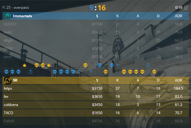 Впервые на мажоре случилось бразильское дерби. SK сошлись с младшим братом, - Immortals. Выбранной локацией для сражения стала карта de_overpass. Ошибки от «бессмертных» дали возможность Fallen'у и ко забирают в свою копилку еще одну игру. Победа со счетом 16:9.