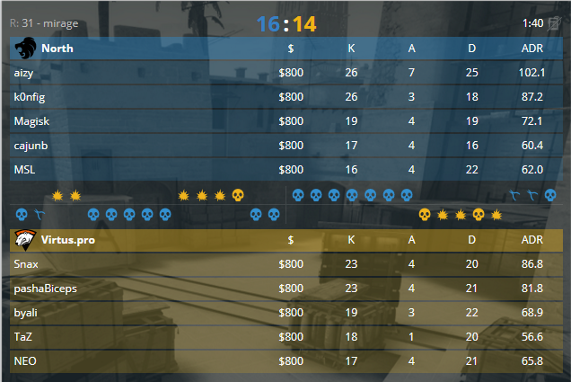 Хозяева PGL Krakow, - польские мишки, разыгрывали еще одну путёвку на «арену». Сражаться за нее им предстояло с представителями Дании из команды North. Очень напряженная игра, что не давала перевеса ни одной команде. Но датчане перестреляли Virtus Pro, и выиграли 16:14.