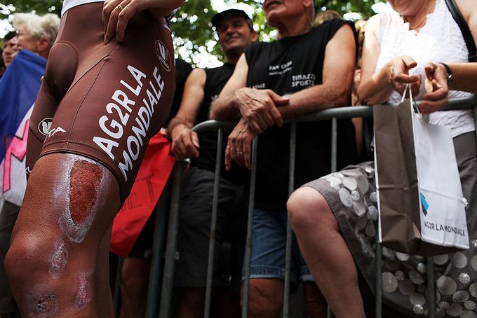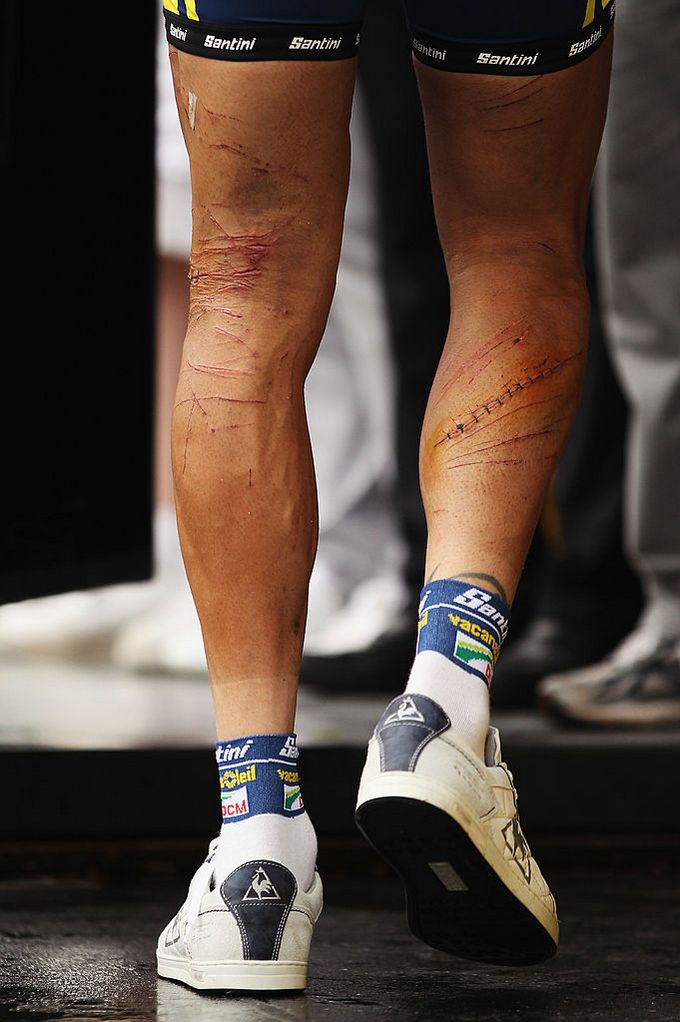 Большие нагрузки – это не единственная беда, которая может поджидать ноги велосипедистов во время длительной дистанции Tour de France. Не меньшую опасность для главного источника заработка спортсменов несут частые падения и завалы во время гонок.